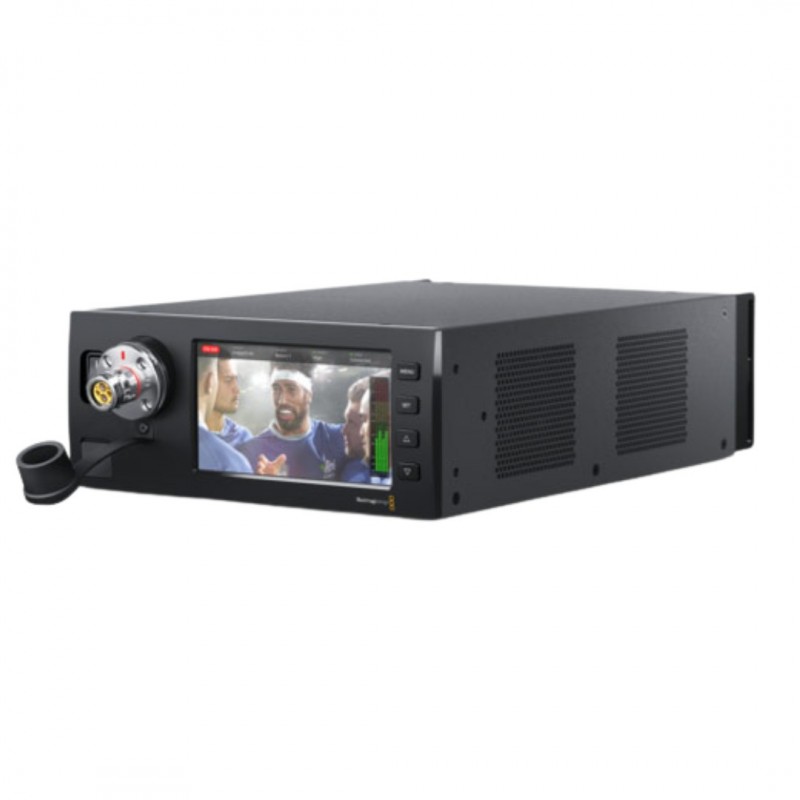 The Blackmagic Studio Fiber Converter is used at the control room end of the SMPTE fiber cable and it handles converting between the SMPTE fiber and SDI video and audio connections. Plus the studio converter has a built in high capacity power supply to drive the SMPTE fiber cable with enough power to the camera and its accessories. There's even a dedicated talkback connector so you can connect to industry standard talkback systems. The large 5 inch LCD screen on the front panel makes it very easy to monitor the camera feed. The SMPTE fiber connector is on the front panel, so the converter can be mounted on the back of a rack, so you don't need an expensive SMPTE fiber patch panel.