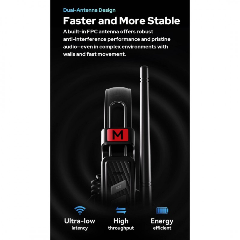 A dual-antenna design combines a built-in FPC antenna with frequency-hopping technology for faster, more stable transmission. The system supports up to a 500-meter transmission range with strong anti-interference performance, even in complex environments with walls or fast movement.