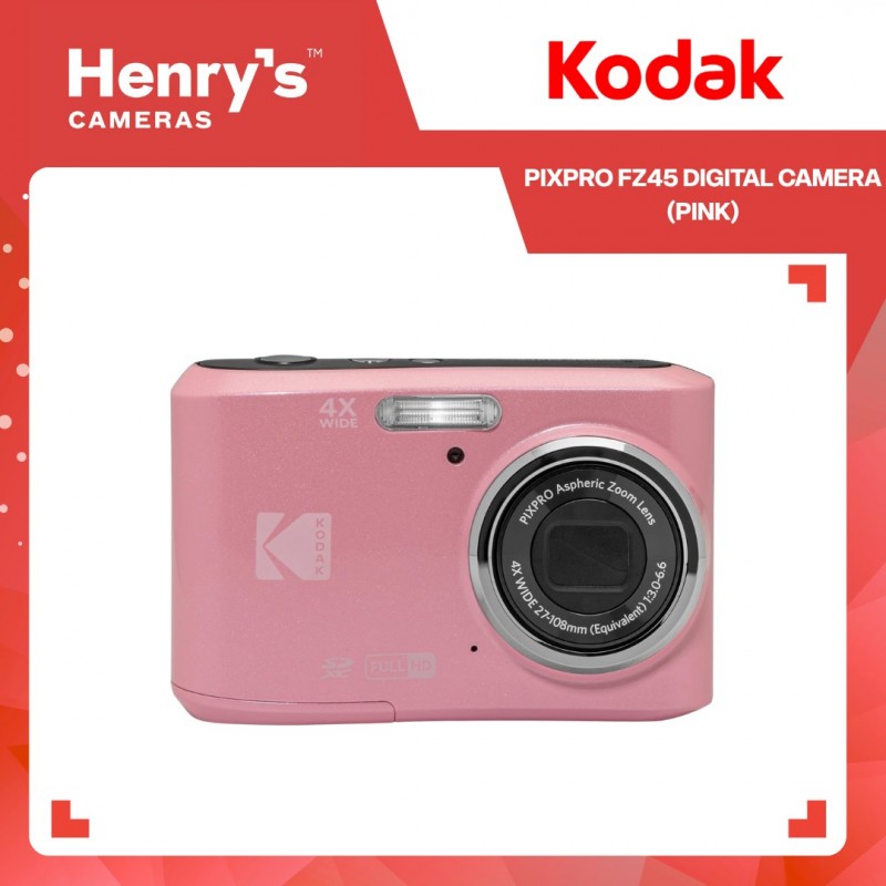 The Pixpro FZ45 Digital Camera from Kodak is a small pink point-and-shoot and one of the friendly zoom models from the Kodak Pixpro digital camera collection. Small and easy to use, this camera is an ideal choice for on-the-go shooting. It is conveniently powered by two AA batteries and features a 2.7" LCD screen, a 4x optical zoom, one-touch Full HD video, red-eye removal, face detection, and more.