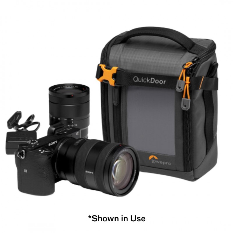 - Holds a full-frame CSC camera with a standard zoom lens attached, plus an additional lens.