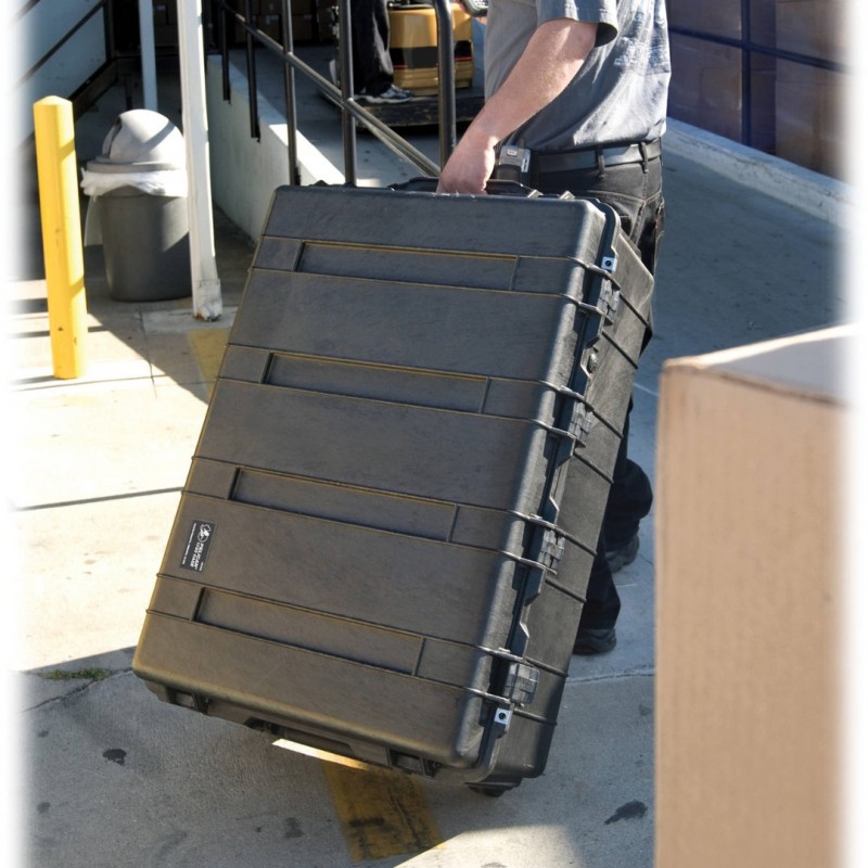 The Pelican 1730 Transport Case with Foam (Black) is a watertight, crushproof. and dust proof polypropylene case. It has six easy open ABS double throw latches with stainless-steel padlock protectors. It has an O-ring and an automatic pressure release valve with a temperature rating -10 to 210°F. There are double-grip fold down handles on each side, and polyurethane wheels with stainless-steel bearings.