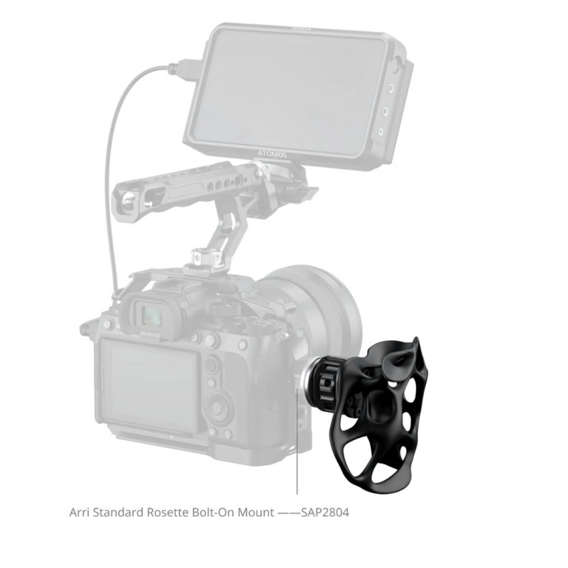 The handle's quick release ARRI-style rosette attaches to a rosette on a shoulder rig, rosette extension arm, or cage using the M6 center screw. The rosette allows you to rotate the handle 360° for the best positioning.