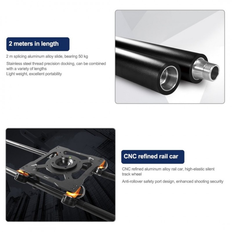 The Greenbull BX200 Heavy Duty Portable Camera slider is an adjustable length slider constructed out of high quality aluminum alloy and is compatible with all kinds of film industry cameras, camcorders or DV cameras. The slider comes standard with a 75/100mm bowl adapter and an optional 150mm bowl adapter is available. When the slider is fully assembled it has a maximum length of 6.56 feet (2m) and can handle a payload of up to 110lbs (50kg). There are 6 rod sections included and that are 26.3″ (67cm) in length. The track wheels provide smooth & stable sliding.