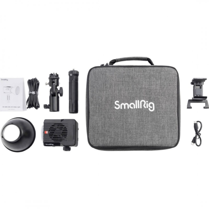 | In The Box | SmallRig RC 60B Bi-Color LED Monolight (Power Bank Clamp Edition), Power Bank Clamp, Mini Reflector (45°), USB-C Charging Cable (9.8'), USB-C PD Charging Cable (0.65'), Light Stand Adapter, Handle, Protective Cover, Carry Bag |