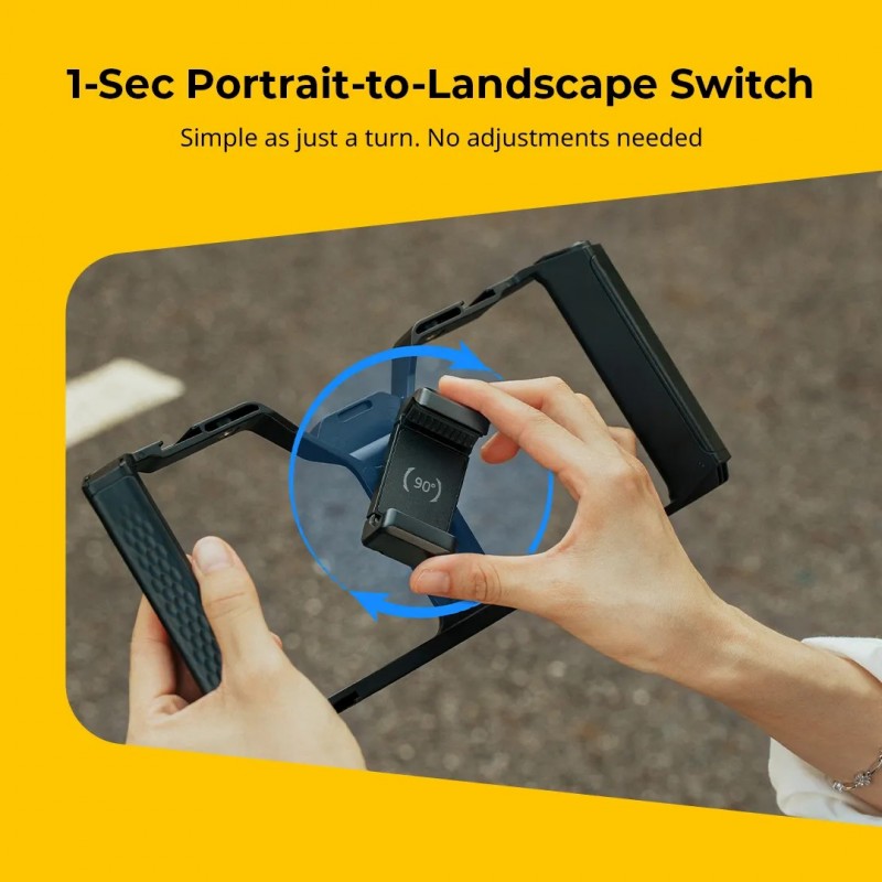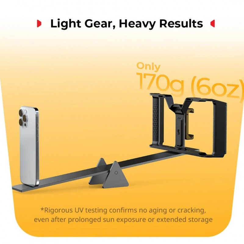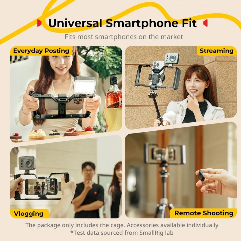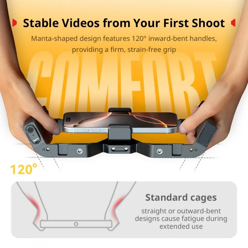 Designed for video enthusiasts, the IG-02 IntegraGrip Cage from SmallRig is a video cage compatible with most smartphones ranging from 2.35 to 3.15" wide, up to 7.09" long, and up to 0.39" thick. It features a dual handgrip design with 120° inward-bend handles for greater stability, and a rotatable phone mount allows for quick switching between landscape and portrait orientations. Thanks to versatile expansion options that include four cold shoe mounts, four strap slots, five 1/4"-20 threaded holes, and one QD socket, you'll be able to accessorize this cage with LED lights, microphones, a tripod, a wrist strap, and other compatible accessories. Thanks to a V-shaped back panel, you'll have a clearer view of your phone. Included is a wireless remote, which will let you capture photos and videos from up to 42.2' away from your device.