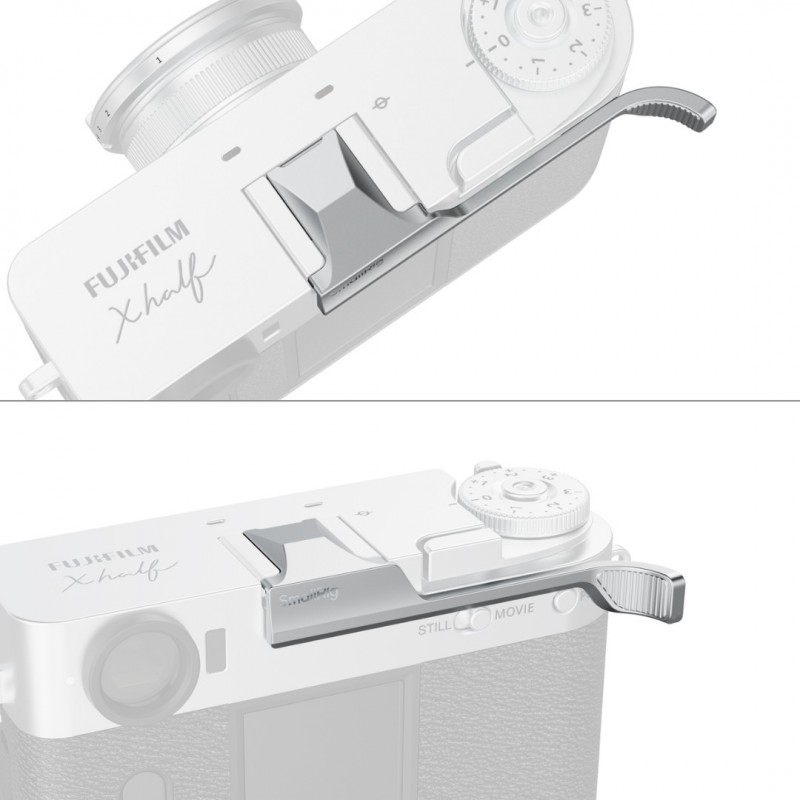 This Thumb Grip for FUJIFILM X half from SmallRig is an ergonomic thumb rest with an anti-slip texture for added grip and comfort. This accessory is color-matched to seamlessly blend in with the camera body. It features a detach slot for instant removal and integrated silicone pads to protect the camera body and hot shoe connection. Use this accessory to distribute weight and enhance grip when holding the FUJIFILM X half with one hand.