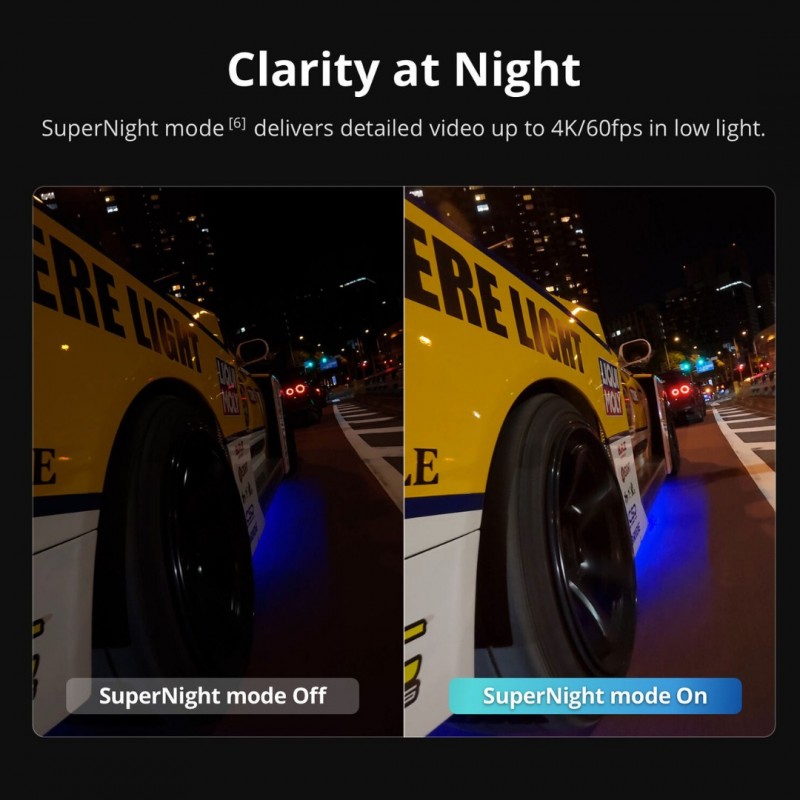 With its larger sensor, larger aperture, and new noise reduction technology, the Osmo Action 6 features SuperNight mode that can capture clear, detailed video in challenging low-light conditions in up to 4K60 resolutions.