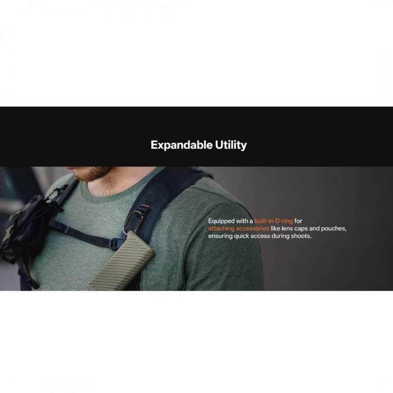 - D-ring clip attaches small accessories including lens caps and pouches