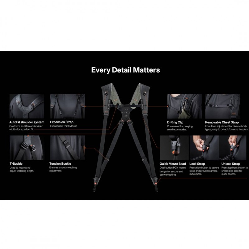 Comfortably carry up to three cameras simultaneously with this Camera Strap Master from PGYTECH. It offers maximum productivity while capturing wildlife, weddings, or events. The strap lengths are adjustable and it has an autofit shoulder system to ensure the perfect fit. The quick bead connectors provide secure and quick attachment and detachment of your cameras. Simply press the upper part of the quick connector to unlock the beads. The loops on the quick connectors are made from three layers of woven fabric, including an inner layer that shows you when it's time to replace your loops. The loops are abrasion resistant and made from UHMWPE, a thermoplastic polyethylene that is ten times stronger than steel wire and able to support 198 lb. This harness is made with resilient EPDM padding and has 115 ventilation holes for breathability and comfort.