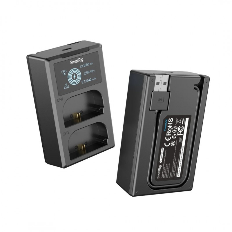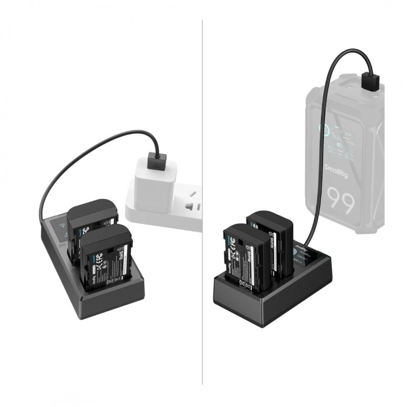 The E6P-BR26 Kit with 2 Batteries and 2-Bay USB Charger + Intelligent Display Kit from SmallRig includes two E6P-BR26 batteries, two battery covers, an E6P-BR26 battery charger, and a 23.6" USB-C cable.