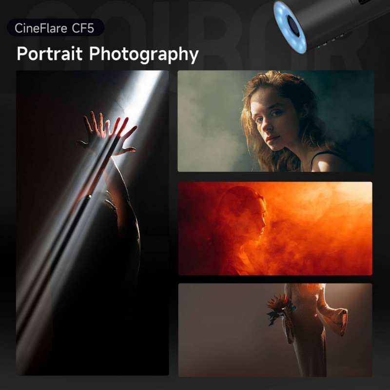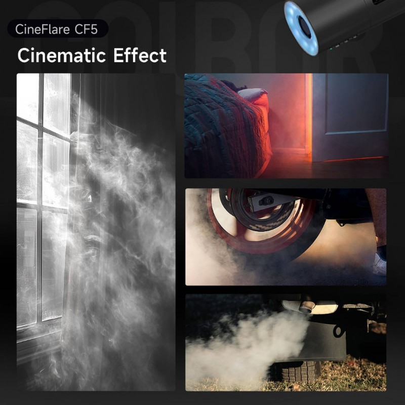 The CineFlare CF5 from COLBOR is a reliable and effective fog smoke machine, designed for precise smoke direction. Its tilted gun-inspired build allows for comfortable handling, enabling users to precisely direct the flow during various applications, particularly low-angle smoke effects. The CF5's adaptable body provides access to interchangeable accessories such as an adjustable magnetic RGB light and fan, a flexible hose, and a nozzle cover. When in "Master Mode," the smoke machine offers various settings and modes that introduce new possibilities during the creative process.