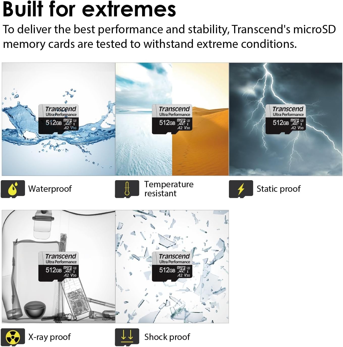 To deliver the best performance and stability, Transcend's microSD memory cards are tested to withstand extreme conditions. They are temperature resistant, waterproof, shock proof, x-ray proof, and static proof.
